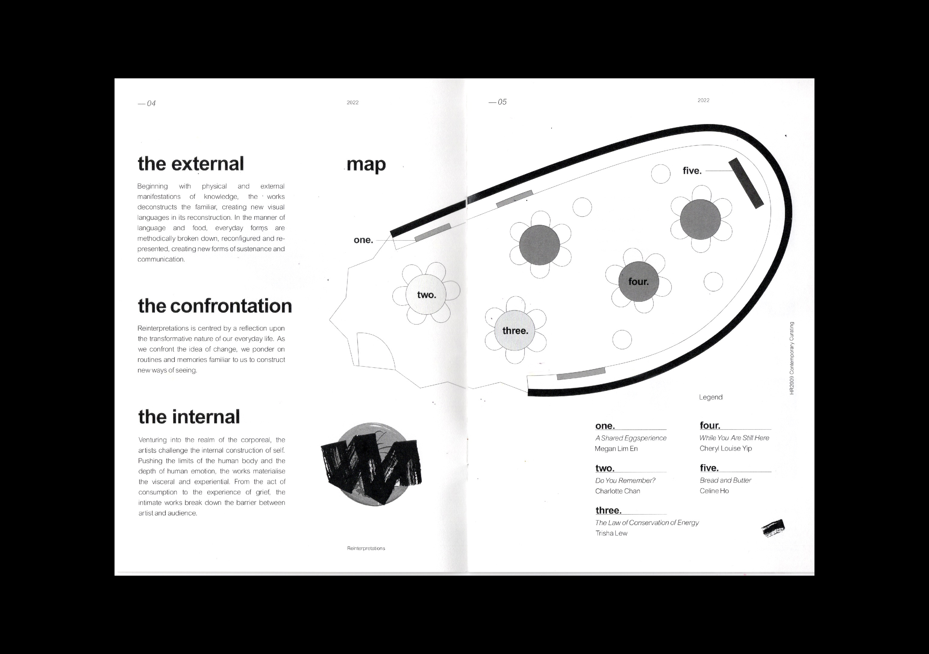 A booklet showcasing five multi-disciplinary works by student artists for an Art History module on contemporary curating at NTU. Through the lens of deconstruction and reconstruction, these artists challenge established norms by reinterpreting shared routines and memories that resonate universally.